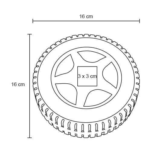 Set de herramientas en forma de neumatico. Contiene: 2 pinzas, 6 desarmadores, 1 destornillador, 4 dados y 10 puntas.