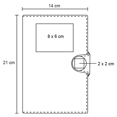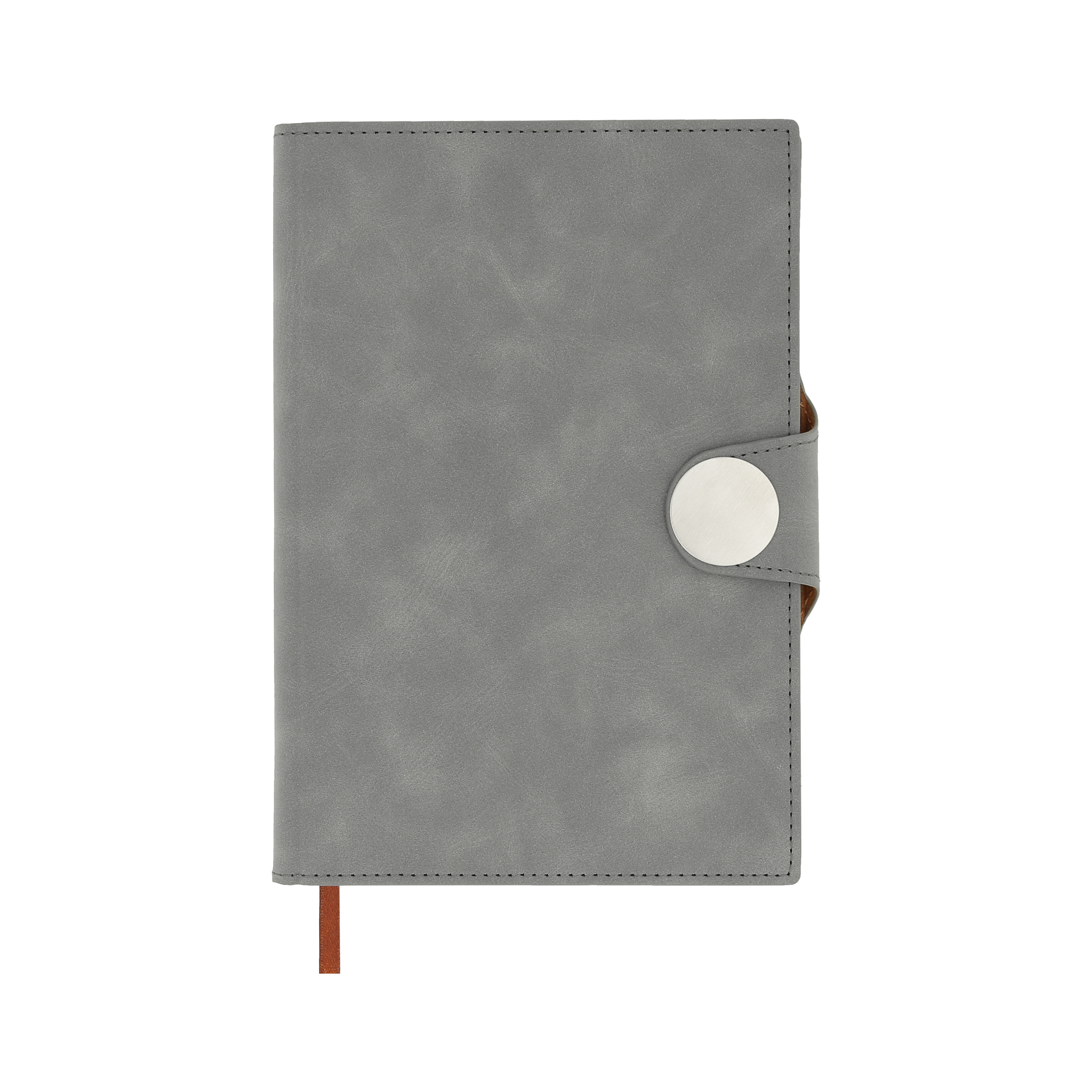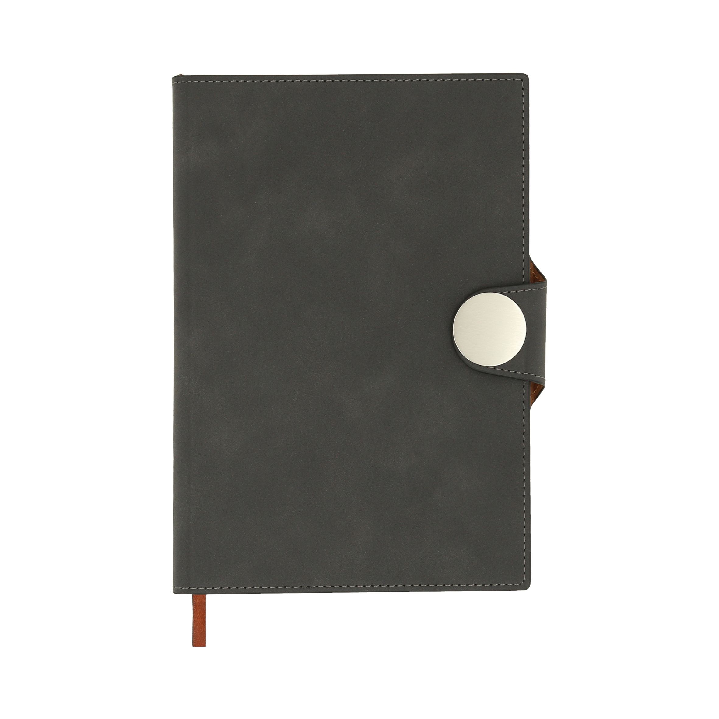 Agenda diaria de cupiel con 100 hojas rayadas, separador y placa metálica circular.