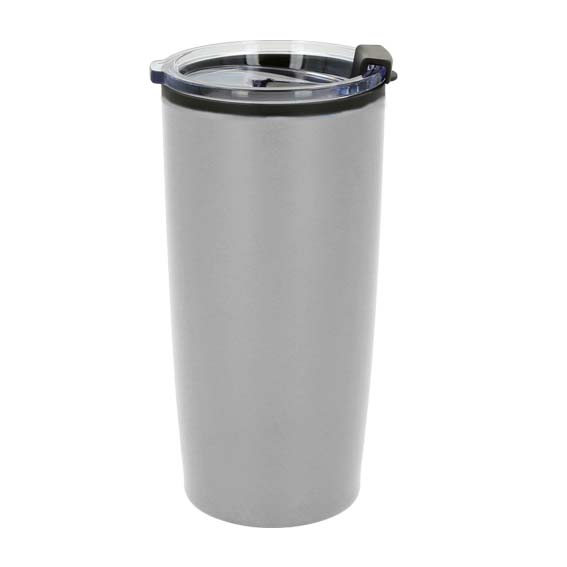 Termo de doble pared con exterior de acero inoxidable e interior de plástico. Incluye tapa de cierre a presión.