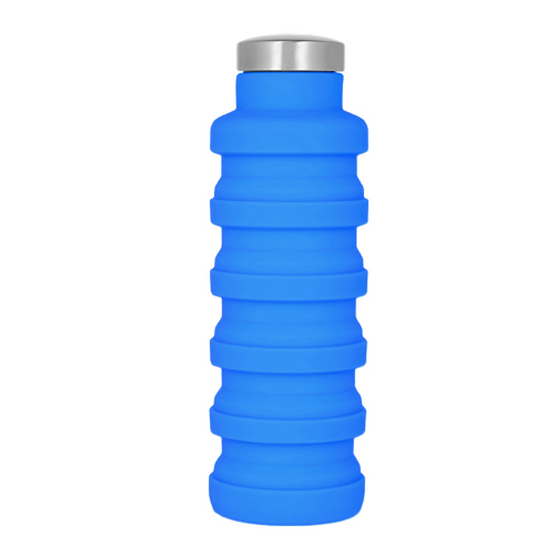 Cilindro de silicón tipo acordeón que se extiende y se contrae, con tapa metálica enroscable y arnés. Incluye bolsa y caja individual.