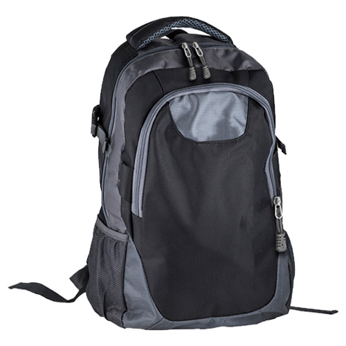 Mochila de 2 compartimentos, 2 bolsillos laterales de red y compartimento central con cierre y divisor interno. Respaldo y tirantes acojinados.