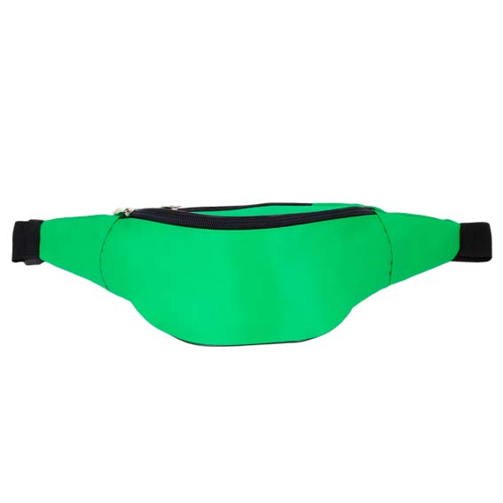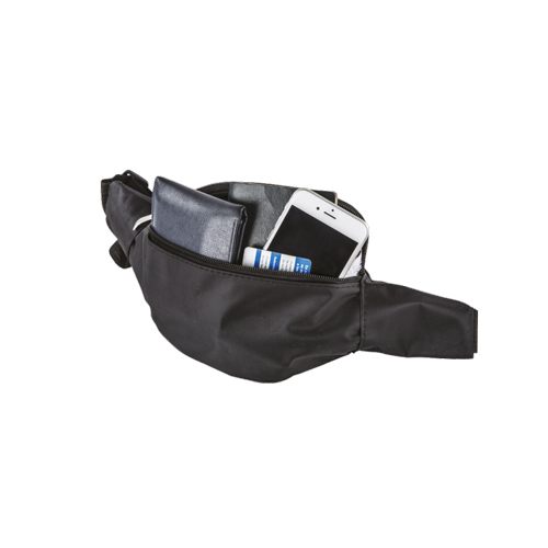 Cangurera de polia©ster con dos compartimentos, cinta ajustable a la cintura y seguro de presion.