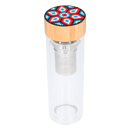 Termo con doble pared de vidrio, infusor de metal y tapa enroscable de bambú. EDICIÓN HUICHOL.