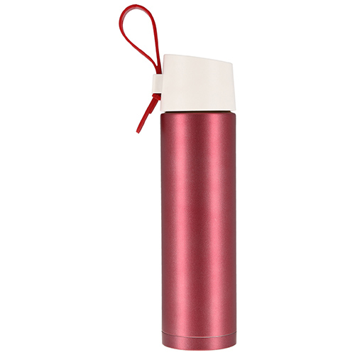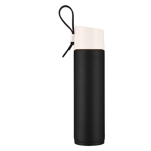 Termo de acero inoxidable con acabado mate y correa para sujetar. Cap. 380 ml.