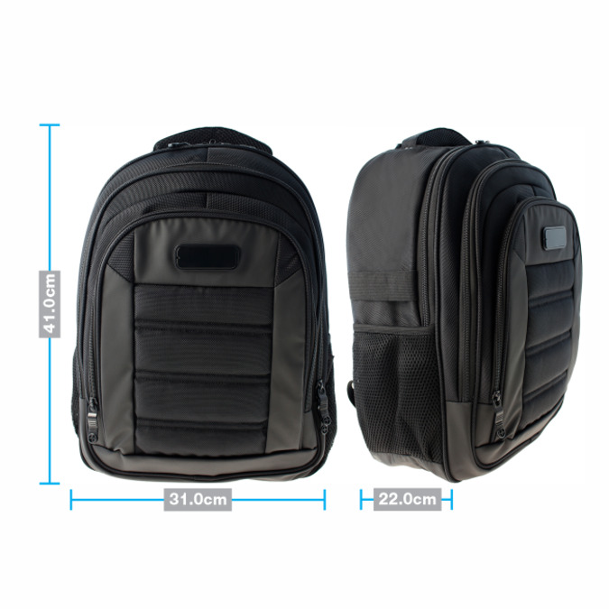 Mochila fabricada en poliéster de alta resistencia. Detalles en curpiel texturizado. Materiales que repelen el agua. Bolsas laterales con malla. El compartimento central cuenta con organizador de accesorios y gancho tipo mosquetón para llaves. Compartimento principal con doble tira cierre habilitado con orificio para colocar cincho o candado. Espacio acolchado para laptop de 15.6. Forros interiores con marca de agua. Asas de colgar acolchadas. Correa para sujetar en bastón de maleta y canal de ventilación en espalda. Peso: 1.06 Kg. Capacidad: 20.33 Litros