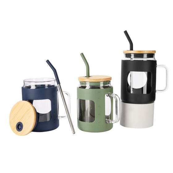 Cilindro de vidrio con asa y manga de silicón graduada en ml. Tapa de bambú con sistema de push y ranura para popote. Incluye popote metálico con boquilla de silicón. Vidrio resistente a bebidas calientes y frías. Caja individual incluida.