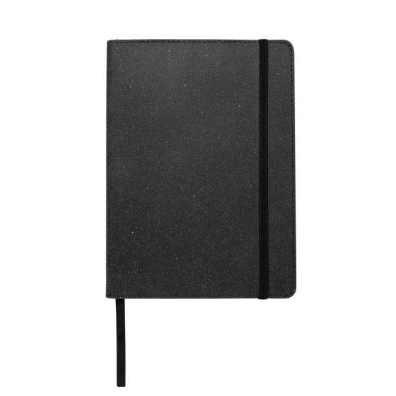 Libreta con 70 hojas de raya fabricada con piel reciclada. Incluye separador de hojas y elástico para cerrar.