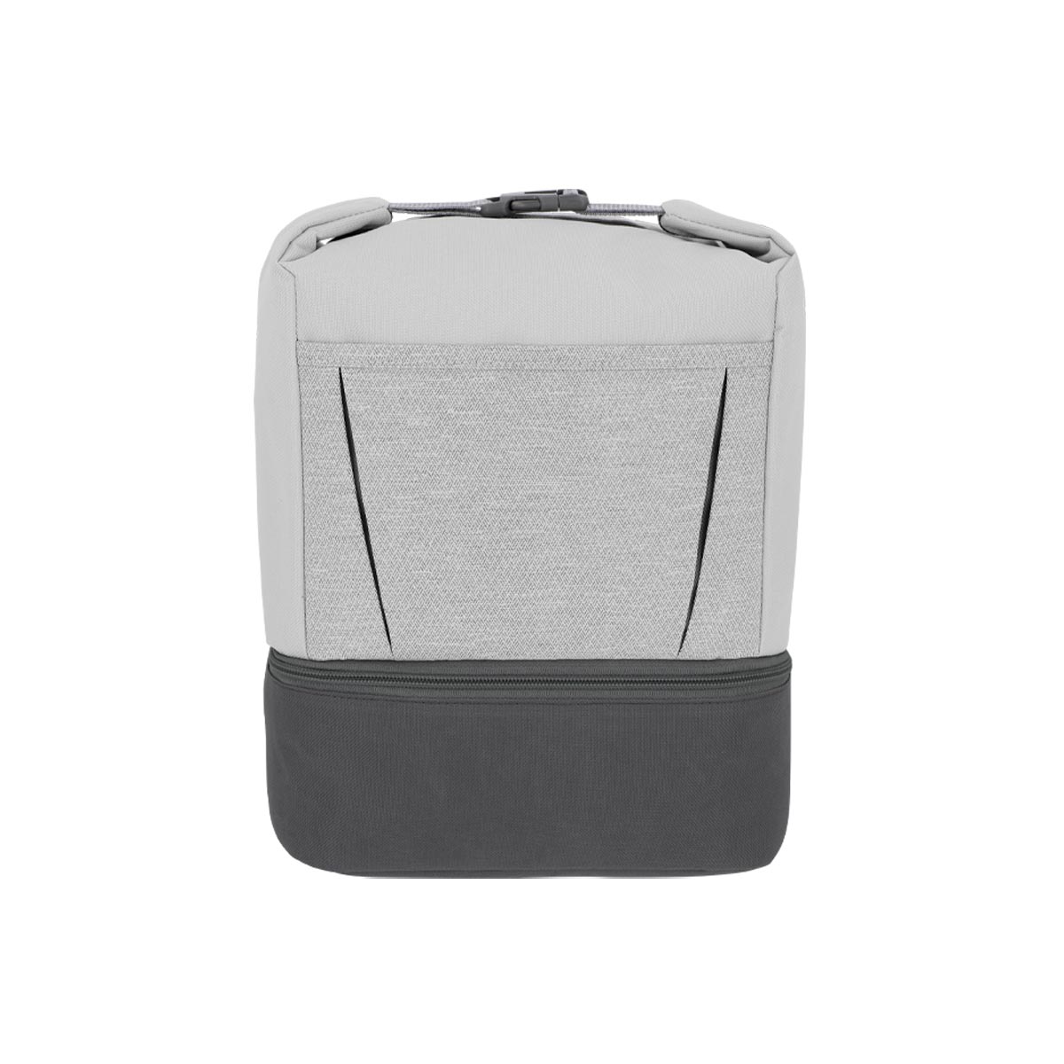 Interior plastificado. Doble compartimento con cierre. Bolsillo frontal. Agarradera con broche de plástico.