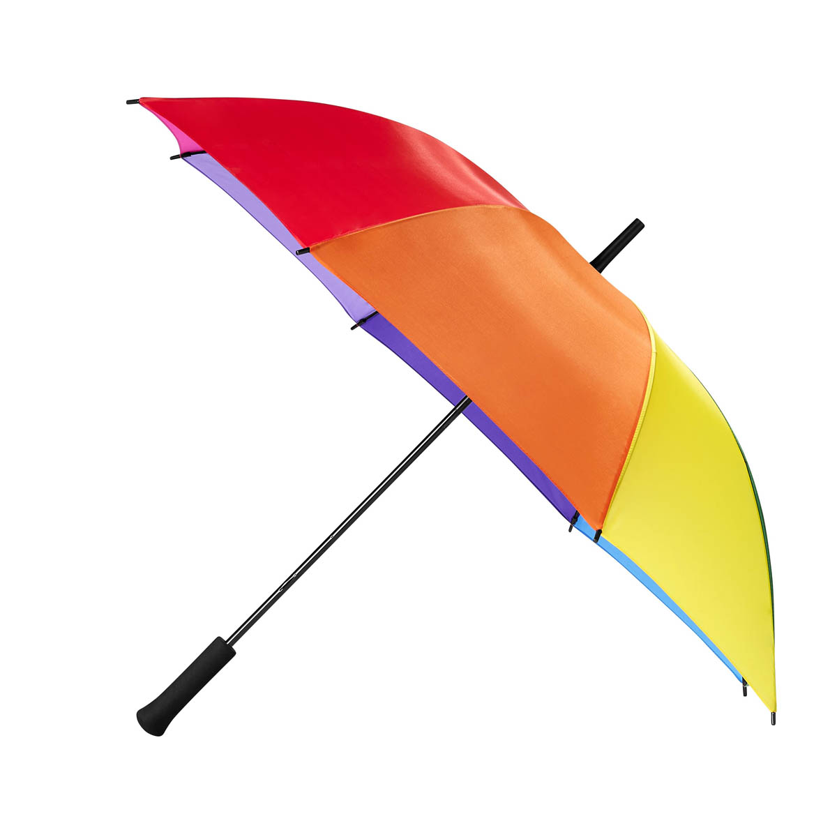Paraguas de 8 paneles, cada panel de un color. Sistema manual. Mango de esponja. Su diseño arcoiris, colorido y alegre refleja la diversidad y la inclusividad.