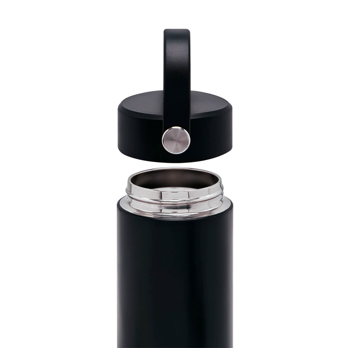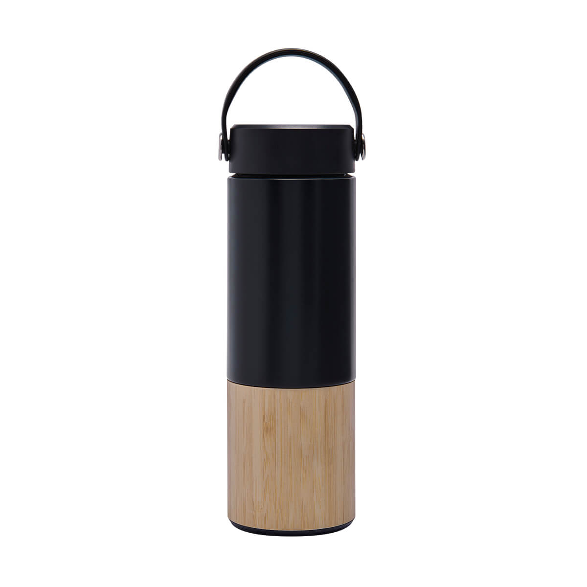 Termo doble pared con base de bambú. Cerrado al vacío. Pared interna y externa de acero inoxidable. Tapa de plástico con asa de silicón y cierre de rosca. Incluye caja individual.