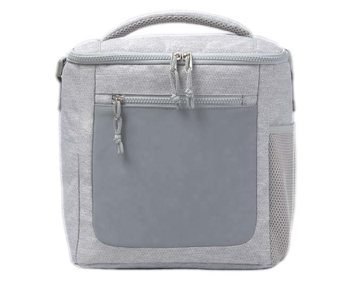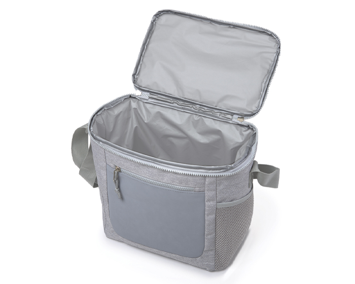 Lonchera/Hielera con tejido texturizado, cuenta con doble cierre en la cubierta, interior termosellado en plástico anti escurrimiento, compartimento frontal con textura y cierre, compartimento lateral de malla con resorte, asa acolchada y correa ajustable para transportar.