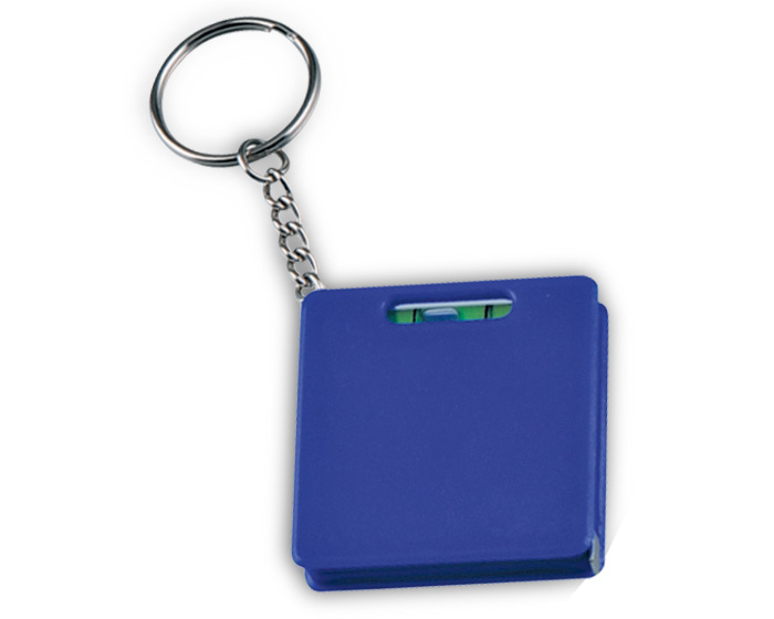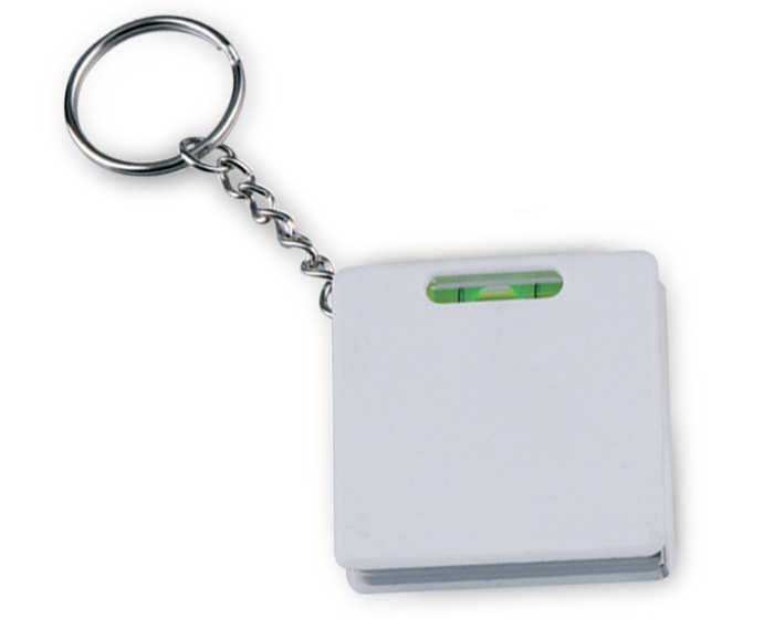 Llavero de plástico con nivelador y flexómetro de 1 mt. de largo.