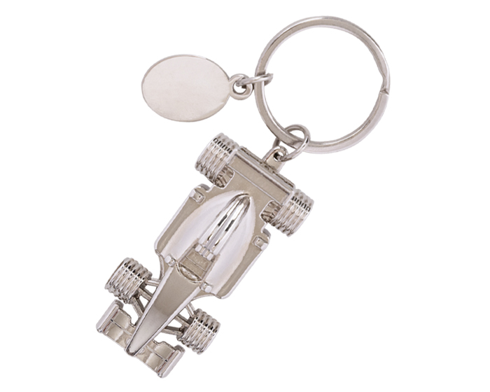 Llavero metálico en forma de auto de carreras con placa de aleación de zinc y arillo reforzado. Presentación: Caja individual de kraft.