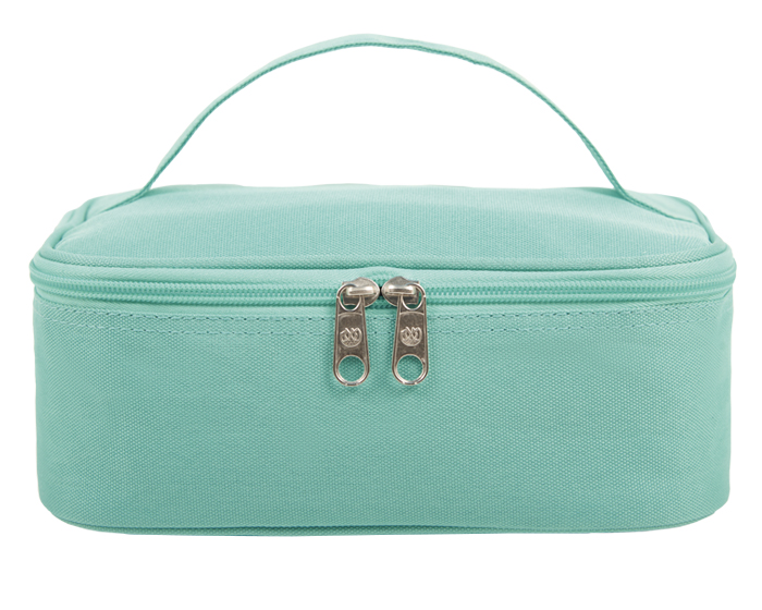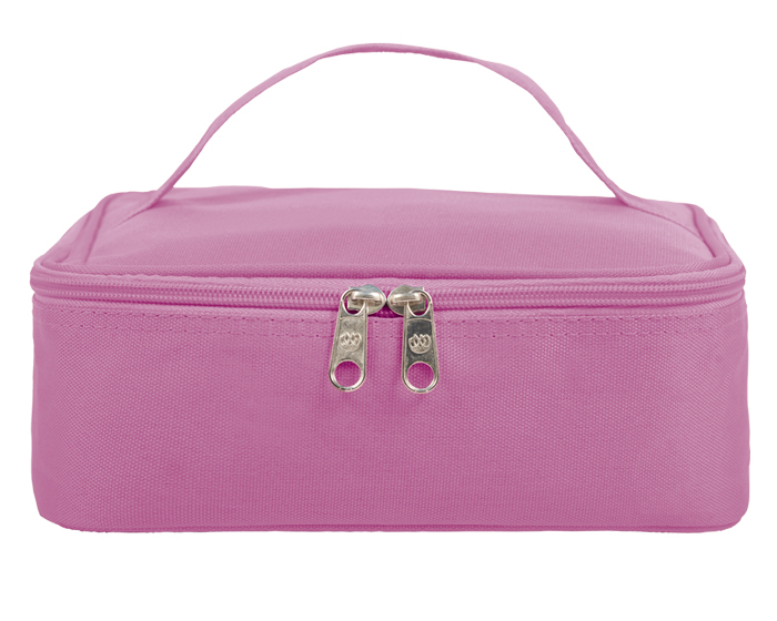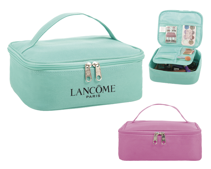Organizador multiusos de poliéster que incluye: asa superior, 2 compartimentos de malla, 2 compartimentos intermedios con resorte y un compartimento amplio en la base para guardar.