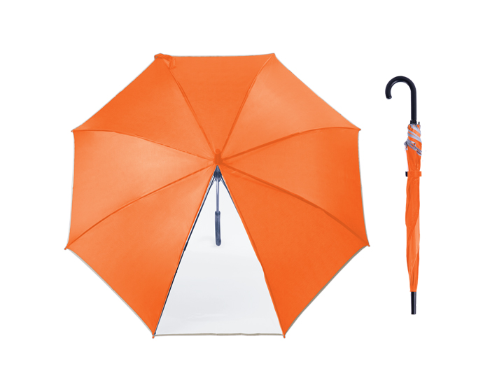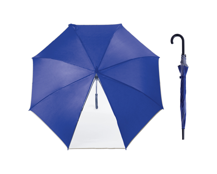 Paraguas antiviento con botón de apertura automático, varillas de fibra de vidrio y eje de metal, mango de plástico, gajo transparente de PVC que permite tener una mejor visión ante la lluvia y orilla reflejante. 8 gajos.