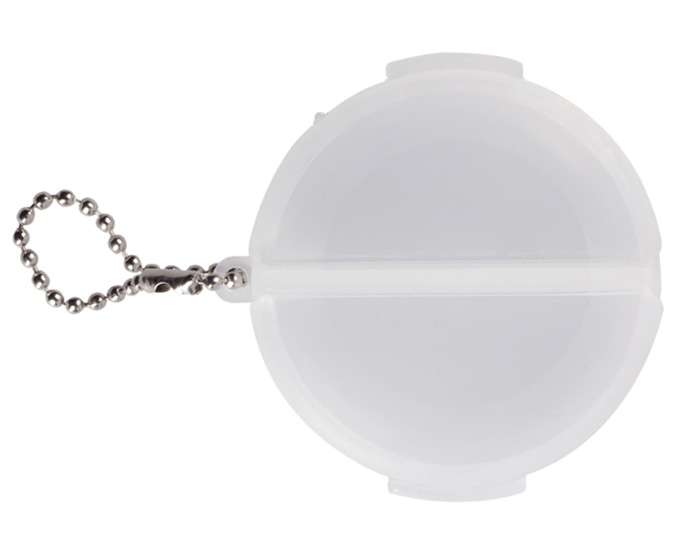 Pastillero de plástico translúcido con doble tapa y dos divisiones, para control de dosis medicinales.