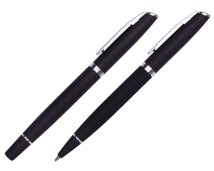 Set de Boligrafos de metal con recubrimiento de goma. Con boligrafo tipo roller con tapa y boligrafo con mecanismo retráctil. Detalles y clip metálicos. Presentación: Estuche de regalo color negro. Medida de los boligrafos 14 x 1.1 cm