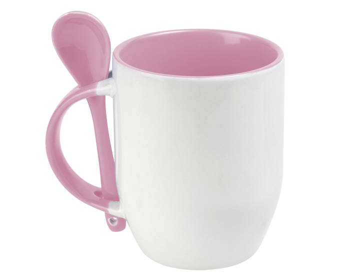 Taza para sublimar con cuchara, asa e interior en color. CAP. 12 OZ. Presentación: caja en color blanco
