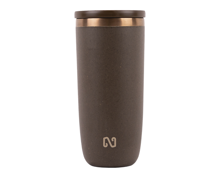 Termo NAYAD NEO de 16 Oz. de doble pared de acero inoxidable, revestido con granos de café reciclado; este termo es biodegradable, amistoso con el medio ambiente; tiene un cintillo metálico color bronce que le dan gran estilo y personalidad, mismo que combina con el botón dorado de su tapa, que hay que deslizar hacia atrás para su fácil apertura. Su tapa enrroscable es antiderrames y antiescurrimiento. CAP. 480 ml. Presentación: Caja de color.