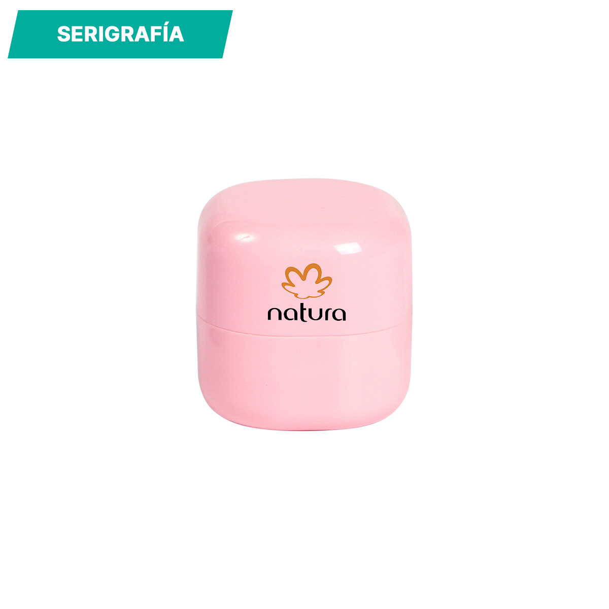 Bálsamo labial de 6.5 gramos, en contenedor de PP (polipropileno), esencia de fresa. Incluye caja de cartón individual.