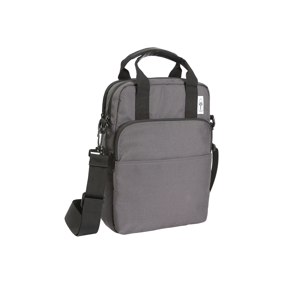 Bolsa para laptop fabricado en poliéster y RPET. cuenta con dos compartimentos, correa de hombro y doble asa.
