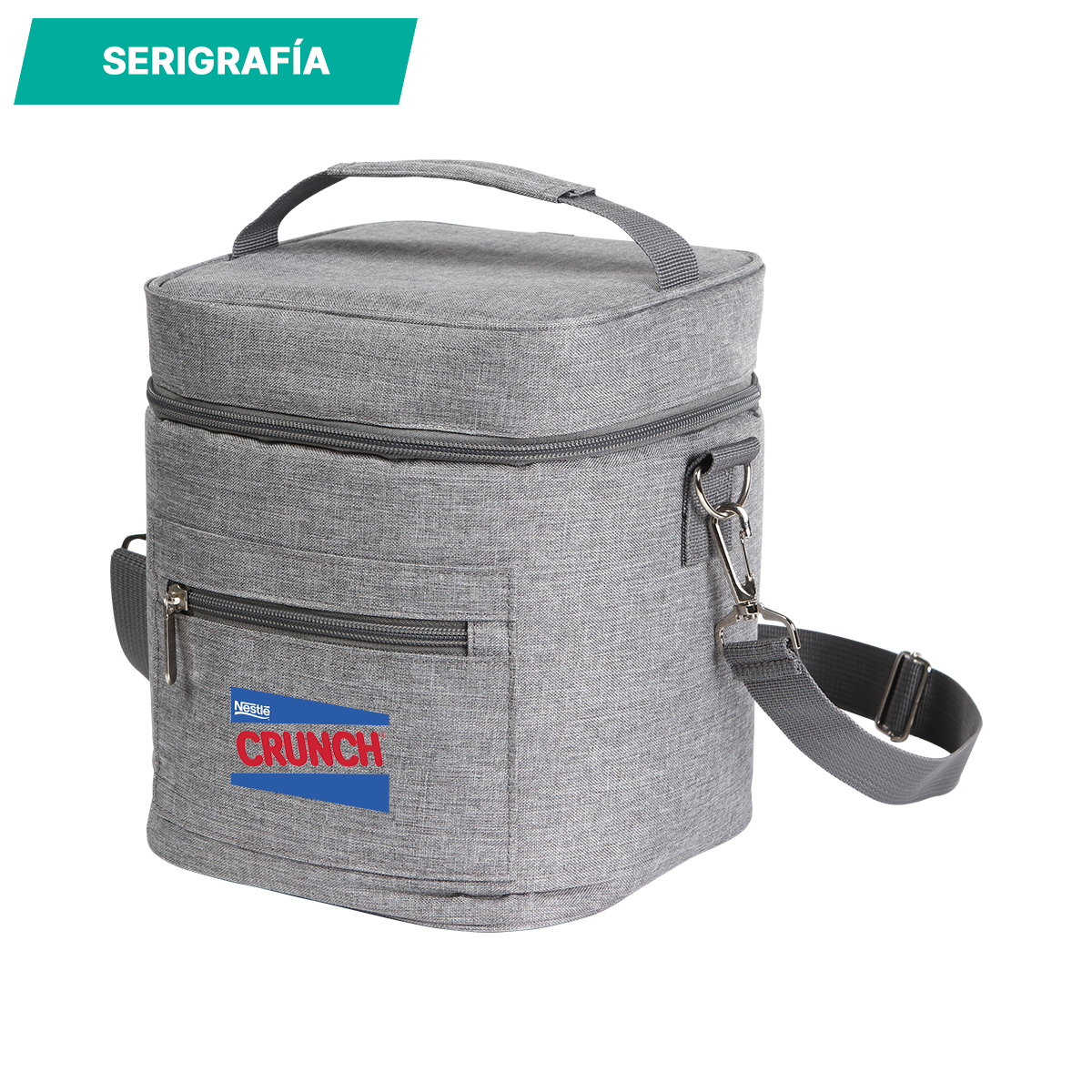 Hielera térmica fabricada en poliéster con forro de aluminio, con bolsillo frontal, bolsillo interno de malla, correa para hombro y asa superior.