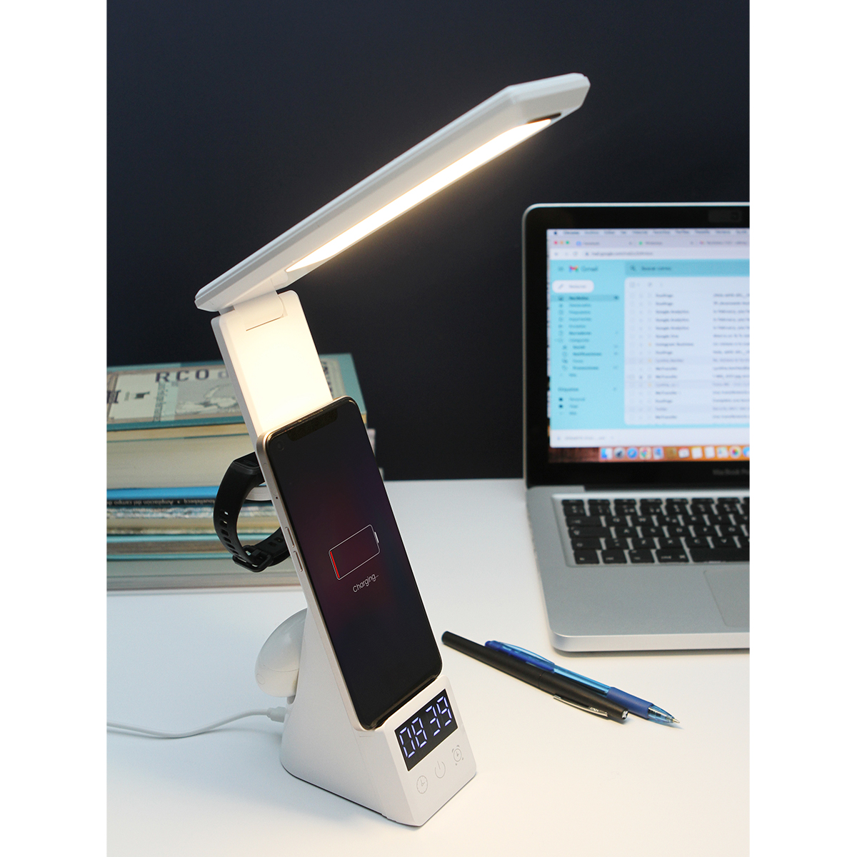 Lámpara LED de escritorio fabricado en plástico ABS para carga inalámbrica, tiene perlas de lámpara de calidad, 3 modos de iluminación, incluido el encendido/apagado y el aumento disminución del brillo, estación de carga inalámbrica para teléfonos móviles, compatible con la carga de iWatch/Airpods. Simplemente coloque el teléfono en la plataforma de carga inalámbrica de la lámpara de escritorio y el teléfono se cargará automáticamente.