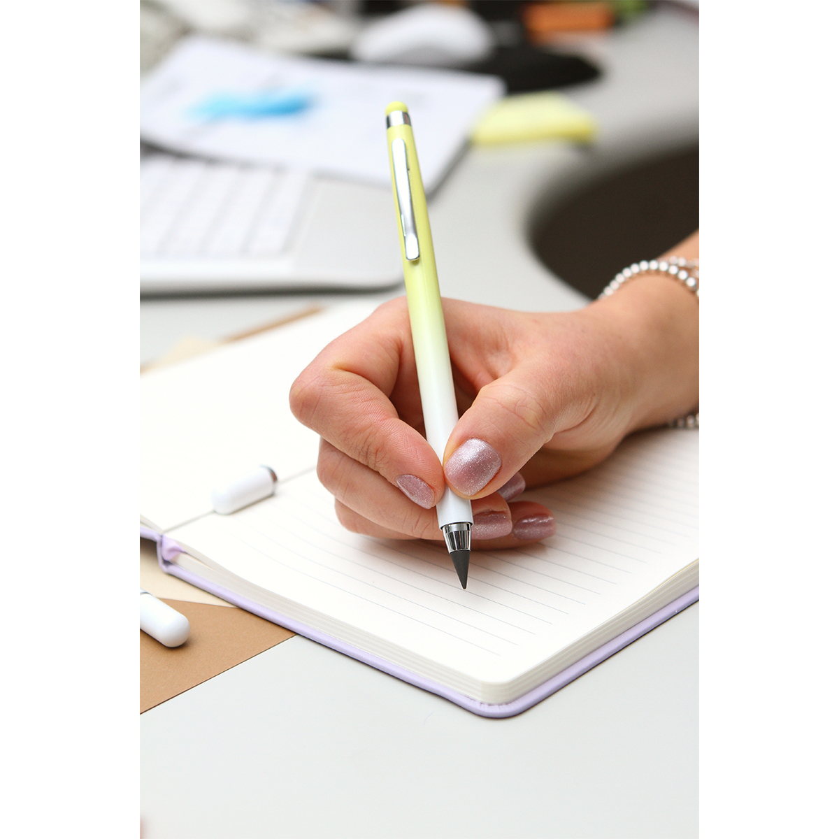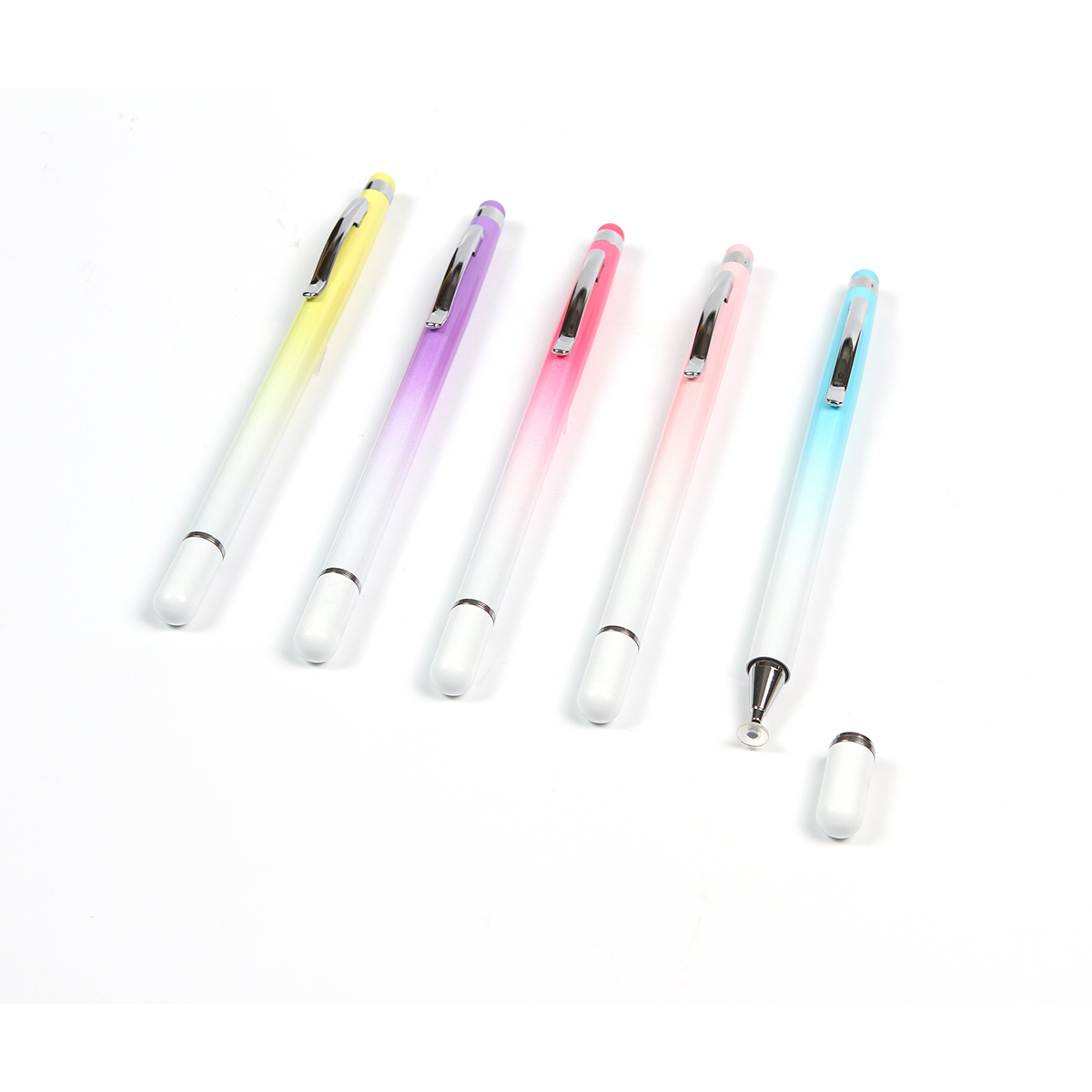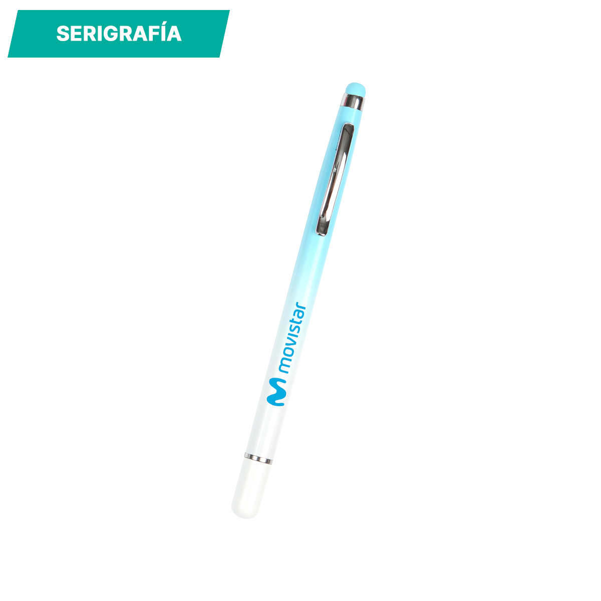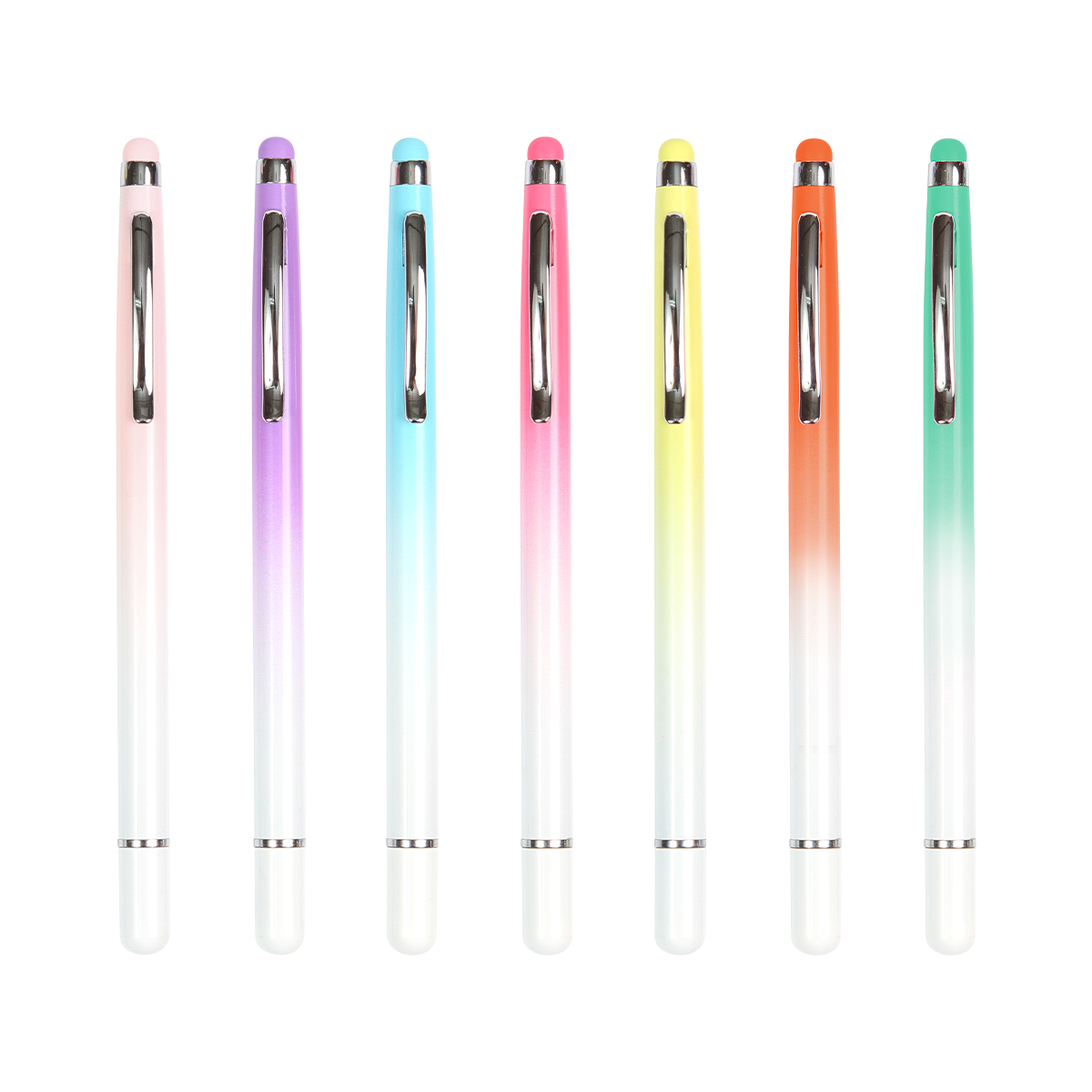 Lápiz tipo bolígrafo dos en uno, con touch en la parte superior para pantallas de dispositivos electrónicos. Barril fabricado en aluminio con clip de metal. Incluye tapa magnética. Disponible en diferentes colores degradados.