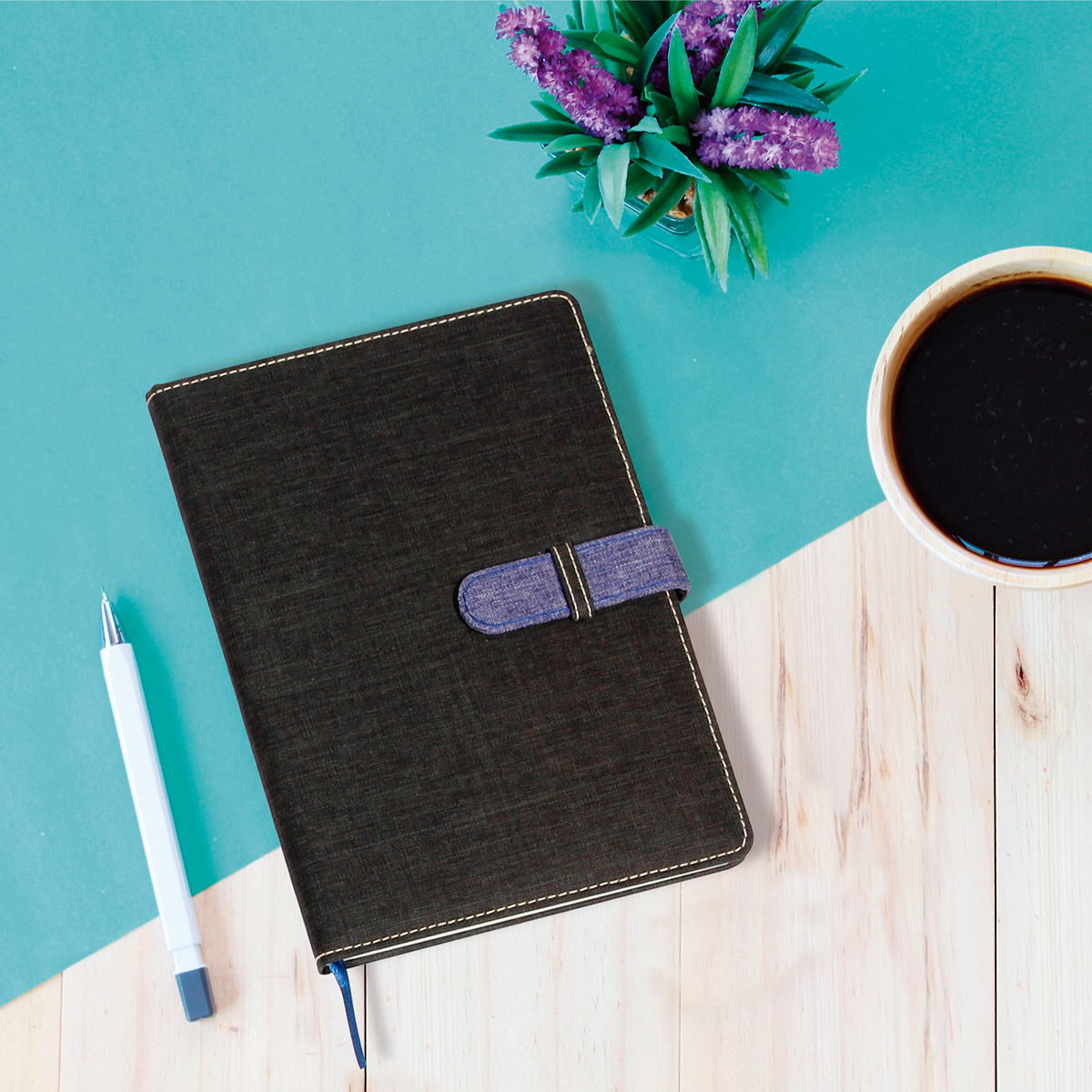 Libreta fabricada en poliuretano con broche y listón separador de hojas en color, con 80 hojas de raya. Tamaño A5.