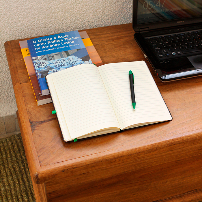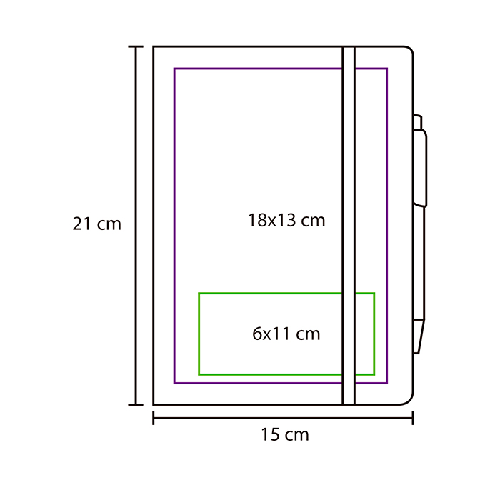 Libreta de pasta rígida con 80 hojas de raya, pluma tinta negra, separador de hojas y banda elástica sujetadora de pastas. Tamaño A5.