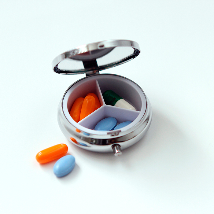 Pastillero con espejo, fabricado en metal y plástico ABS, con tres compartimentos.