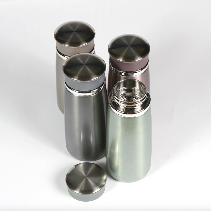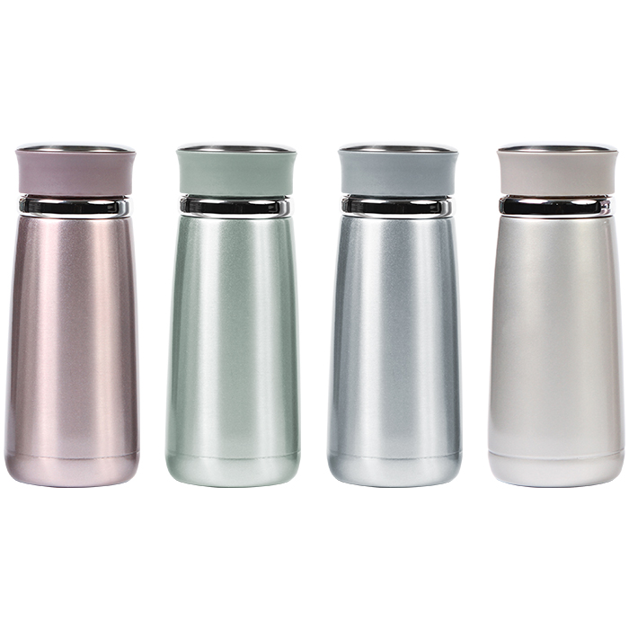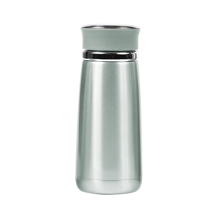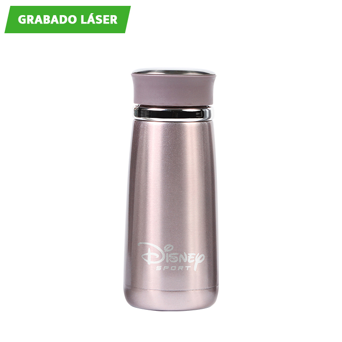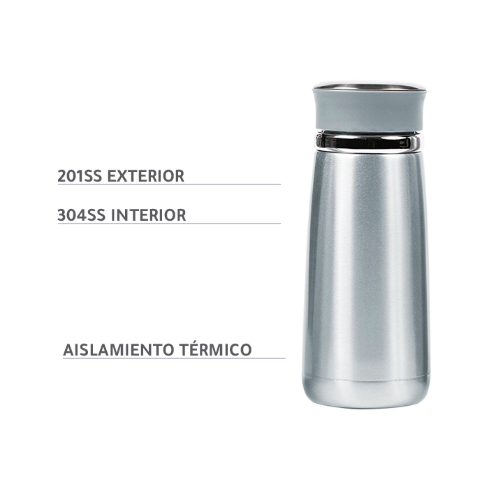 Termo de acero inoxidable doble pared con acabado brillante y detalles metálicos, fabricado en materiales de grado alimenticio, mantiene bebidas frías o calientes por un largo tiempo, no usar en microondas. Capacidad de 420 ml (14 oz). Incluye caja de cartón individual.