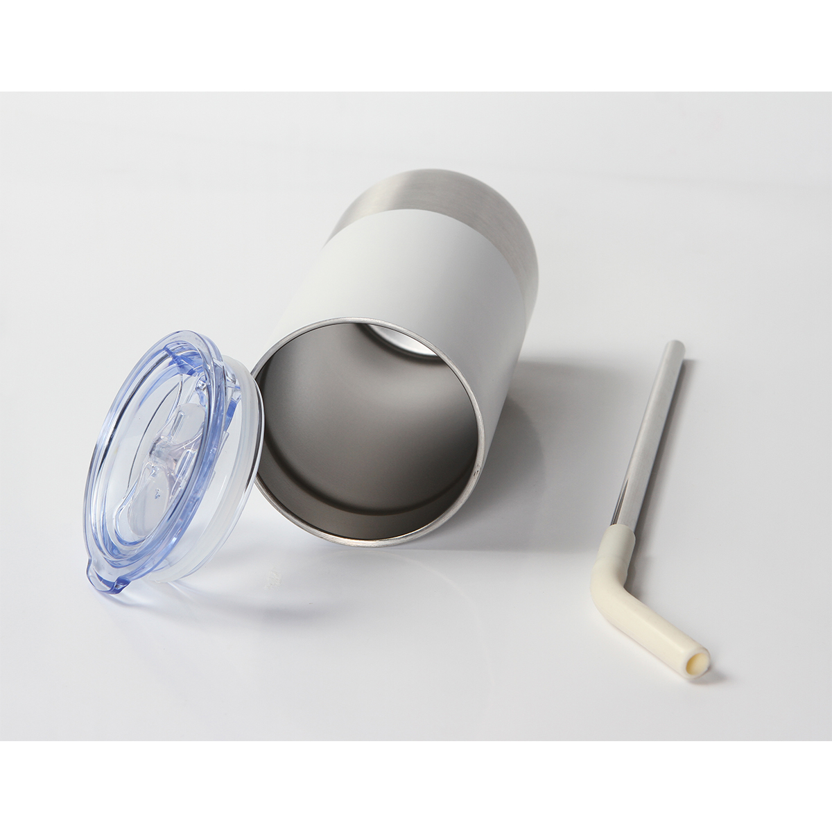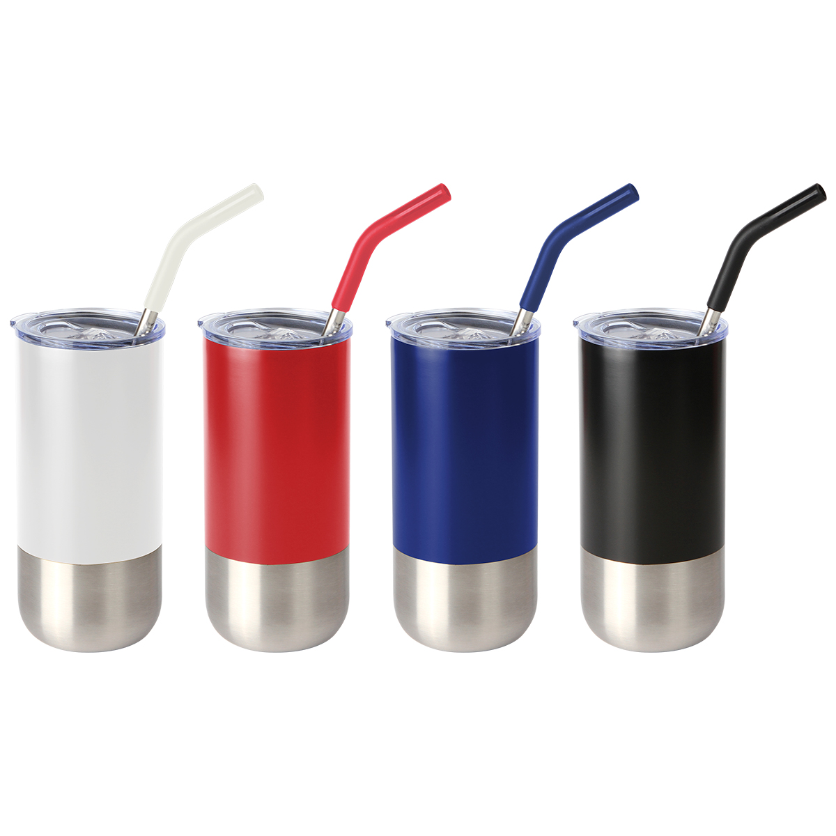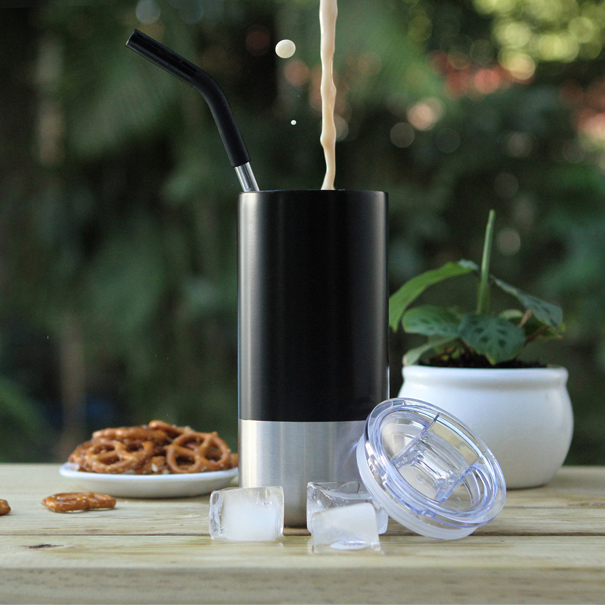 Termo doble pared con interior de acero inoxidable, con tapa de plástico transparente, popote de acero inoxidable con boquilla removible de silicón. Capacidad de 480 ml. Incluye caja de cartón individual.