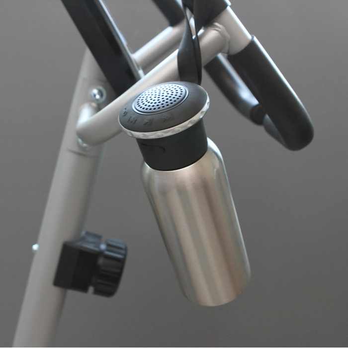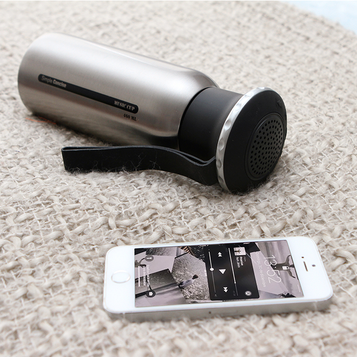 Termo de acero inoxidable doble pared con bocina bluetooth y radio FM, fabricado en materiales de grado alimenticio, mantiene bebidas frías o calientes por un largo tiempo, no usar en microondas. Capacidad de 460 ml (14 oz). Incluye caja de cartón individual.