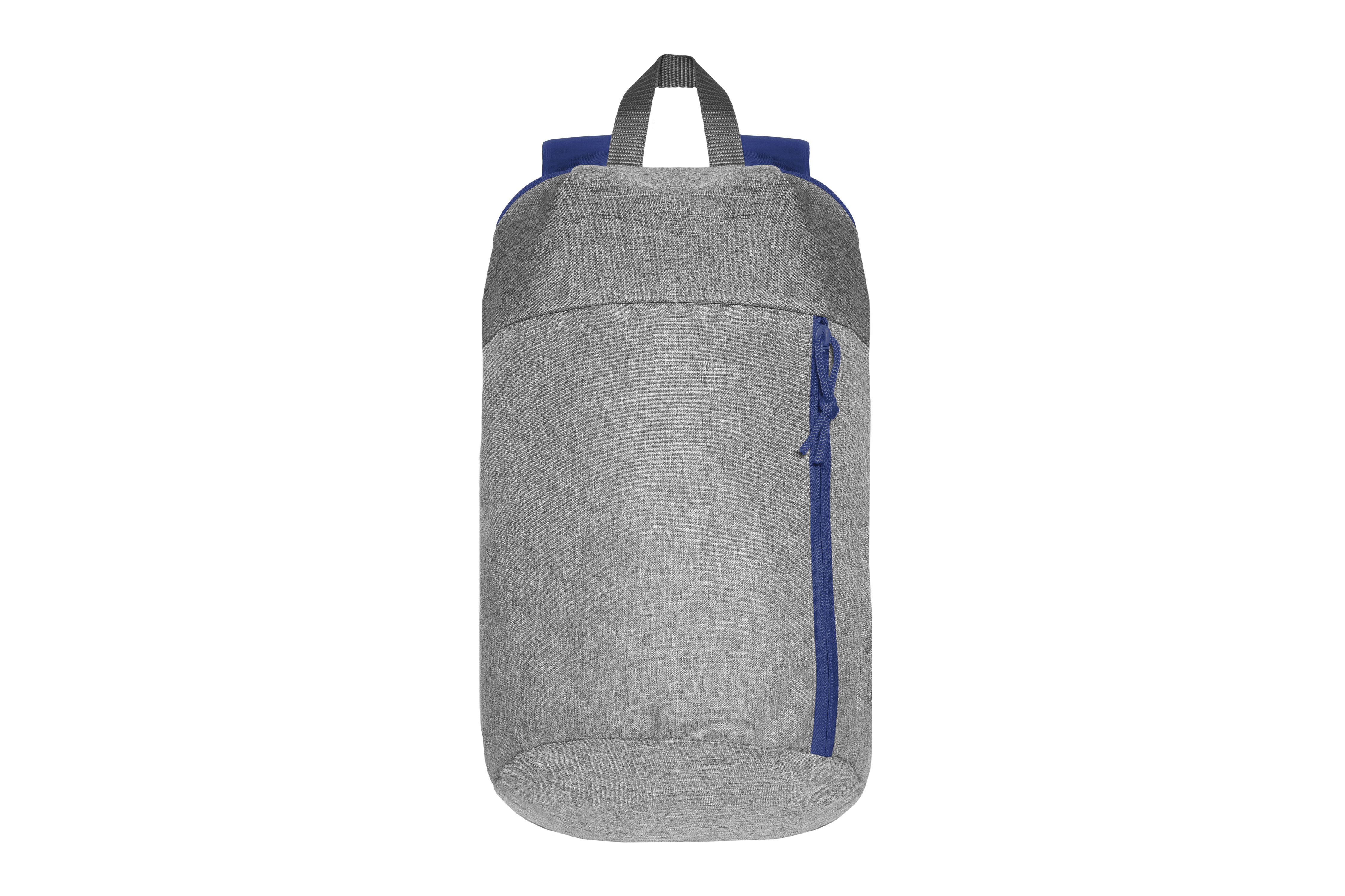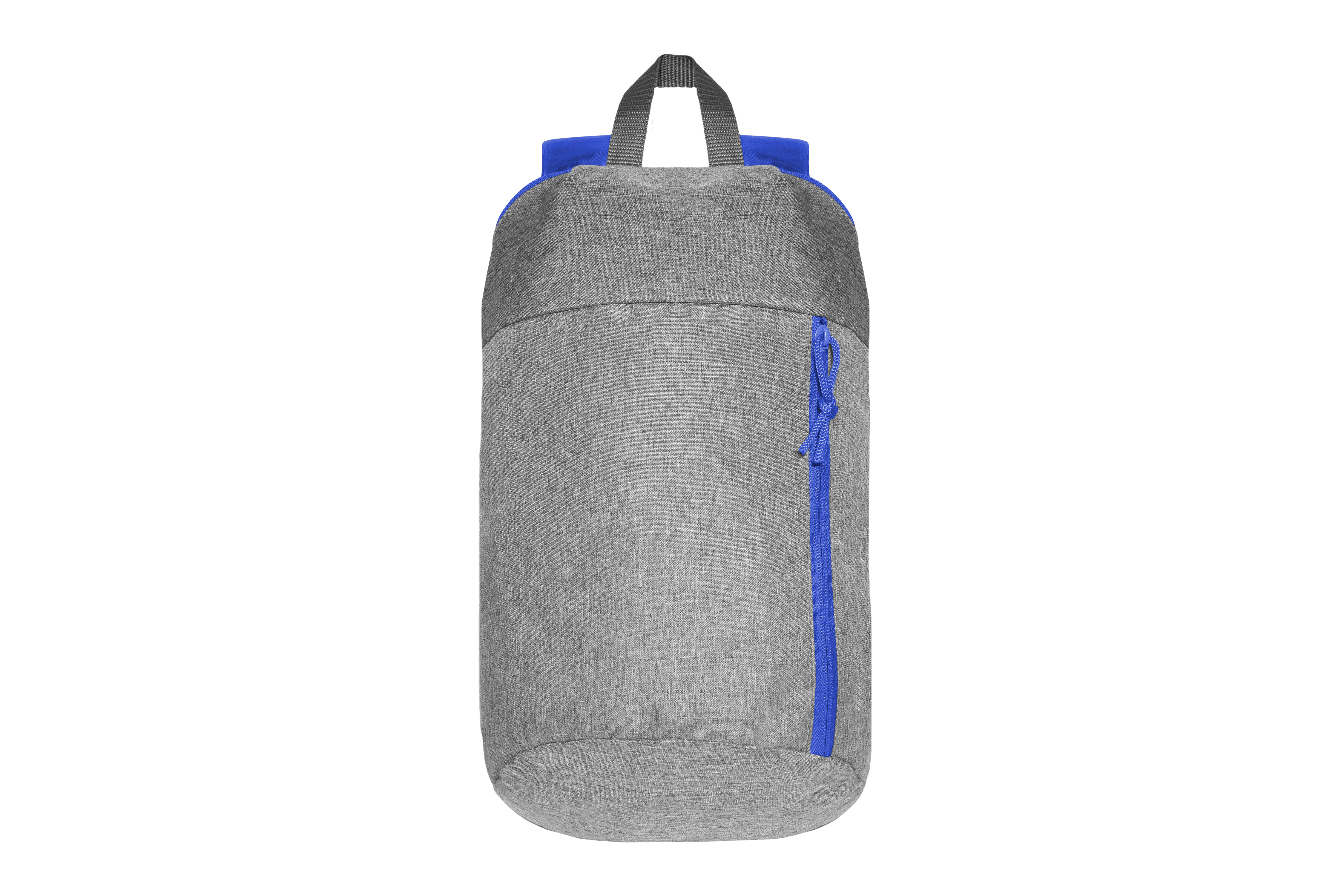 Mochila con un compartimento principal, bolsillo frontal con cierre, detalle de color en la tira y hebilla de soga del mismo color. La parte de atras acojinada de color.