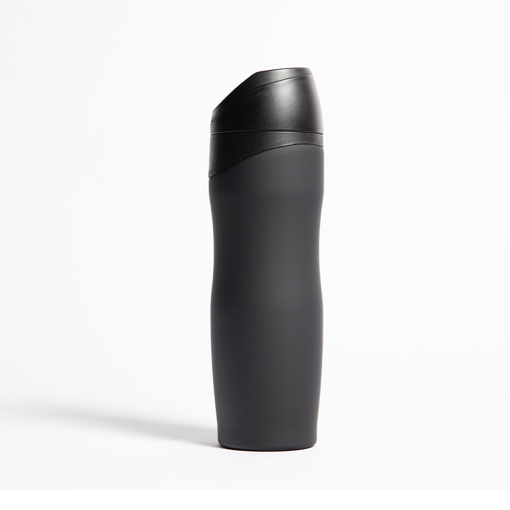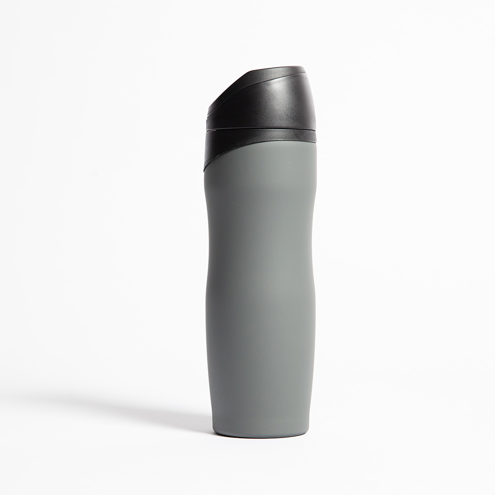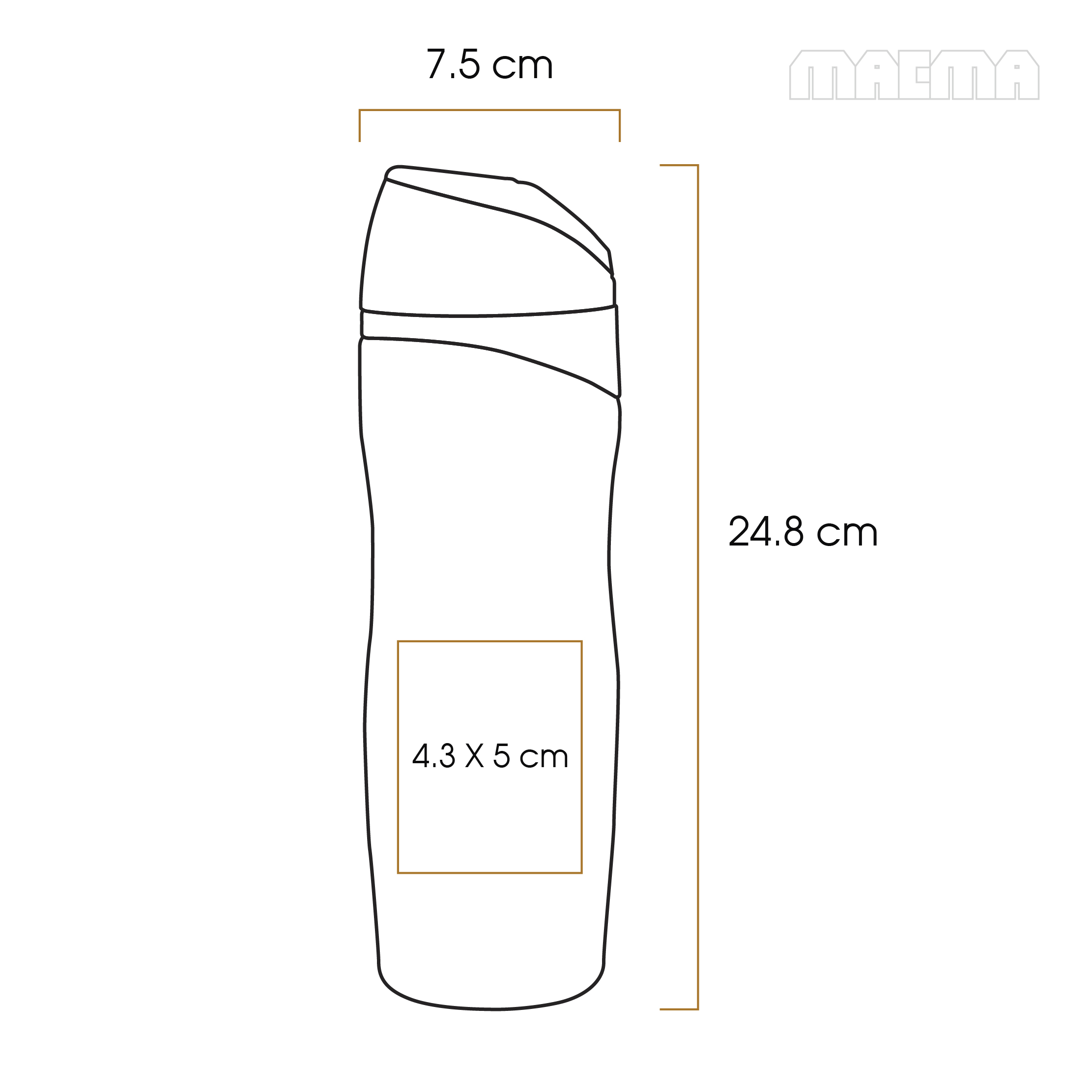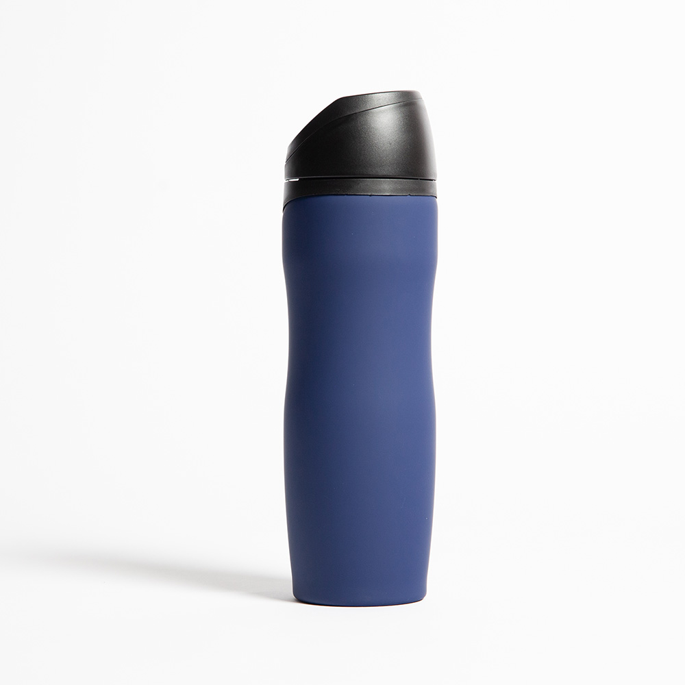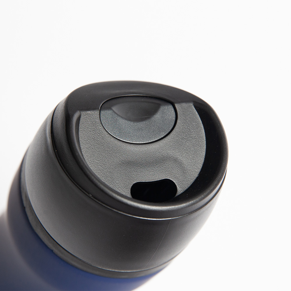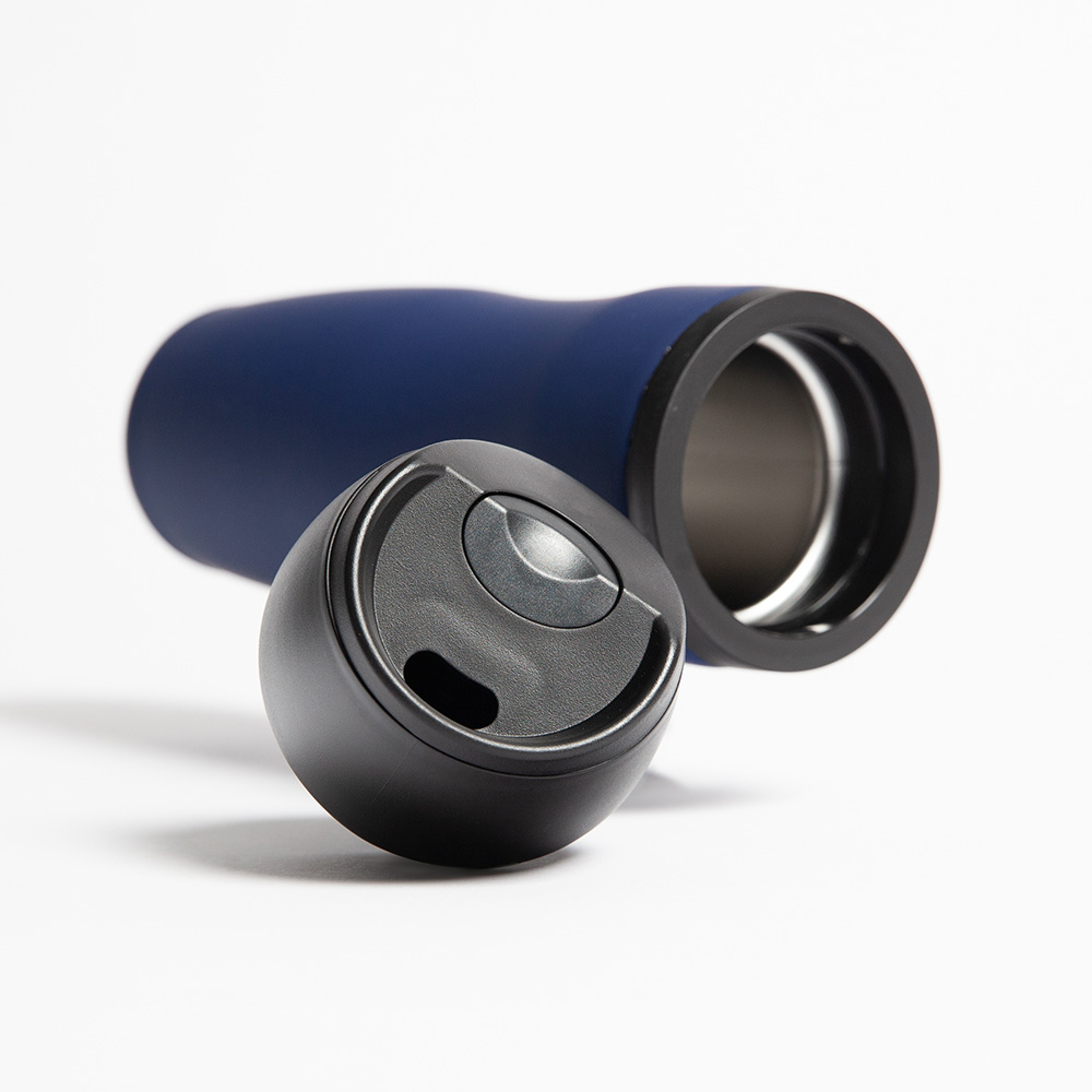 Termo de acero inoxidable de doble pared insulada al vacío. Terminado Rubber y tapa con cierre de rosca con botón pulsador para abrir y cerrar. Capacidad de 450 ml. Certificación FDA.