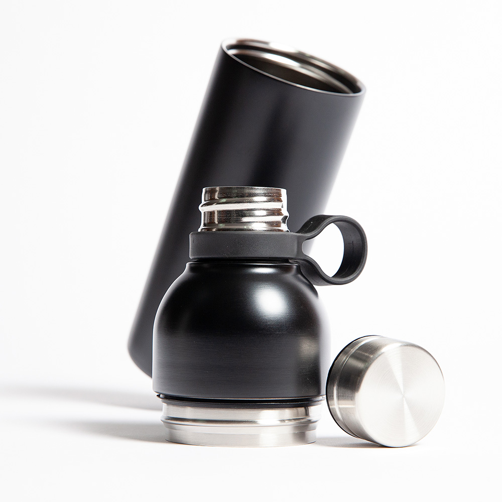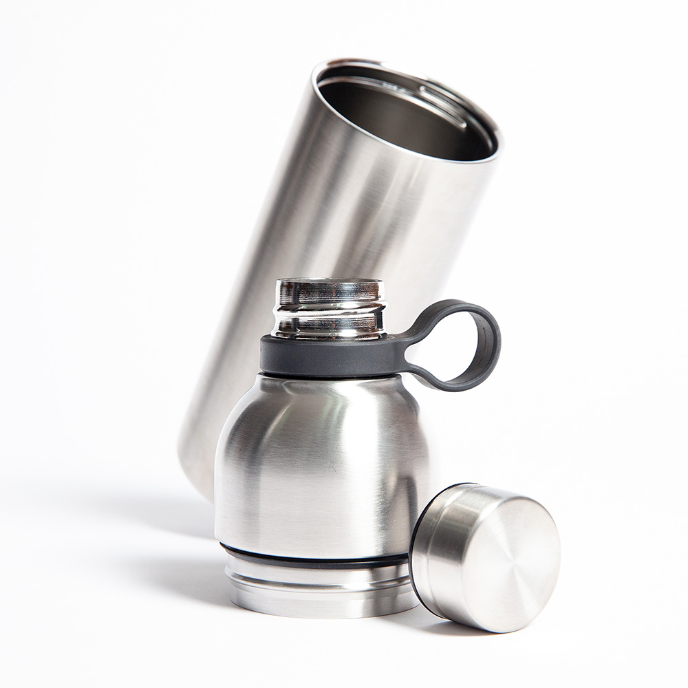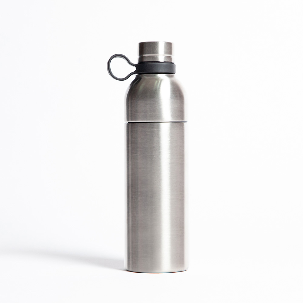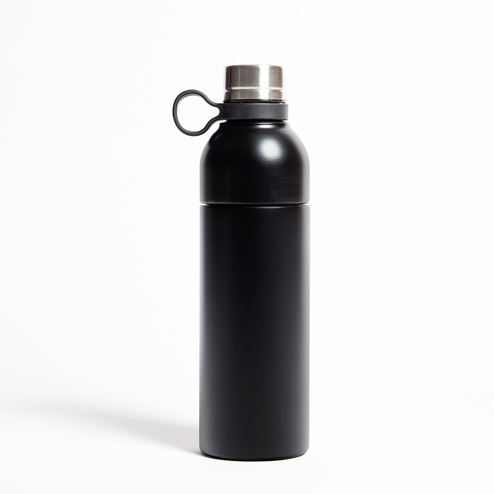 Botella de acero inoxidable de doble pared insulada al vacío para mantener las bebidas frías o calientes por más horas. Tapa con cierre de rosca y agarradera. Rosca para abrir la botella y hacer la función de un vaso. Capacidad de 750 ml. Certificación FDA.